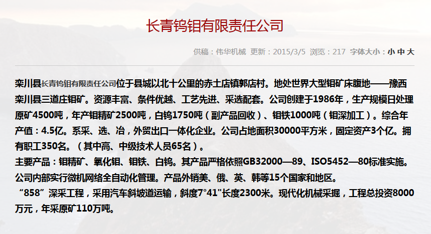 • 合作單位:長青鎢鉬有限責任公司